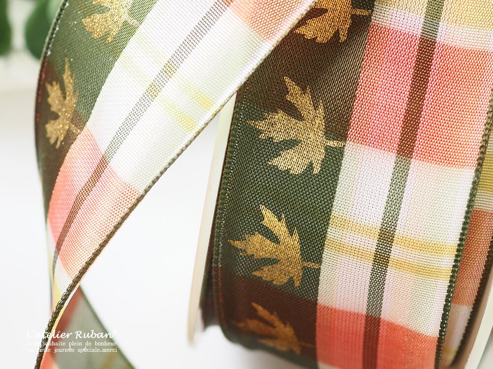 フランス製リボン「メープルとチェック(ミルクオレンジ)」38ミリ ワイヤー入り