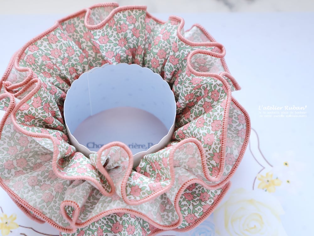 サーモンとピンクの中間のようなお色に合わせて、縁飾りを選びました。